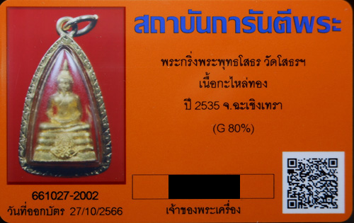 พระกริ่งหลวงพ่อโสธร ภปร. พิมพ์เล็กชุบทอง วัดโสธรวราราม จ.ฉะเชิงเทรา ปี 2535 บัตรรับรอง GPra *แกะจากเลี่ยมไม่มีกรอบทองแล้ว*