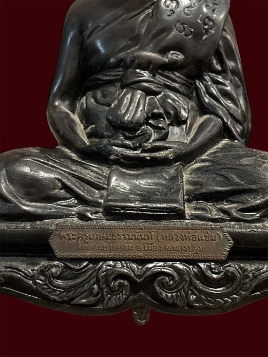 พระครูเกษมธรรมนันท์ (หลวงพ่อแช่ม) วัดดอนยายหอม อ.เมือง จ.นครปฐม ขนาดหน้าตัก 5 นิ้ว ฐานกว้าง 5.5 นิ้ว สูง 7 นิ้ว ใต้ฐานมีรอยจารยันต์ด้วยหมึก สภาพสวยมาก ผิวหิ้งเดิม ๆ