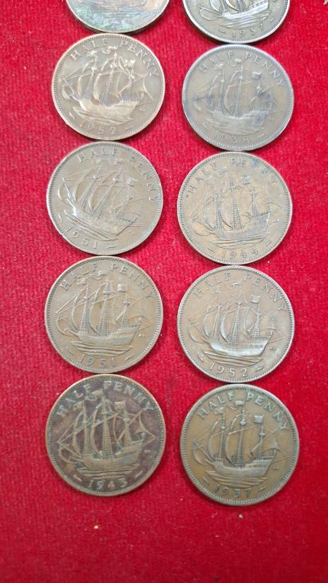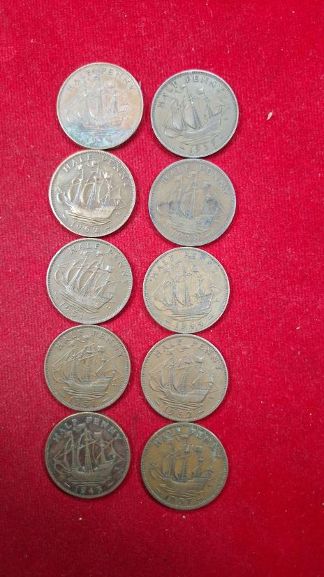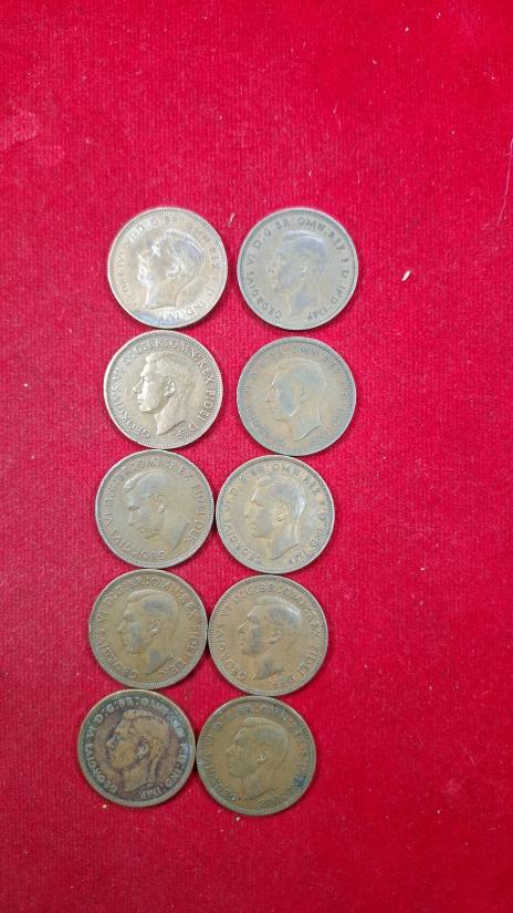 เหรียญครึ่งเพนนี (Half Penny) ของสหราชอาณาจักรอังกฤษ ปี1944,1937,1952,1938,1951,1944,1943ในสมัยสมเด็จพระเจ้าจอร์จที่ 6 ปีลึก รวม10เหรียญ