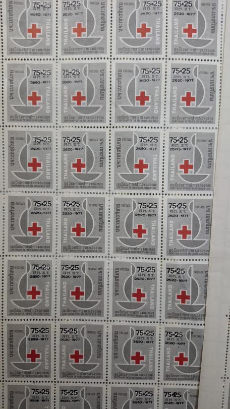 ถูม แสตมป์ที่ระลึกครบรอบ 100 ปีการกาชาดสากล พิมพ์ทับ พ.ศ. 2520 ของประเทศไทย ทั้งหมด5แผ่นเต็ม