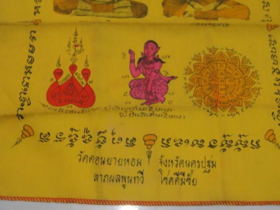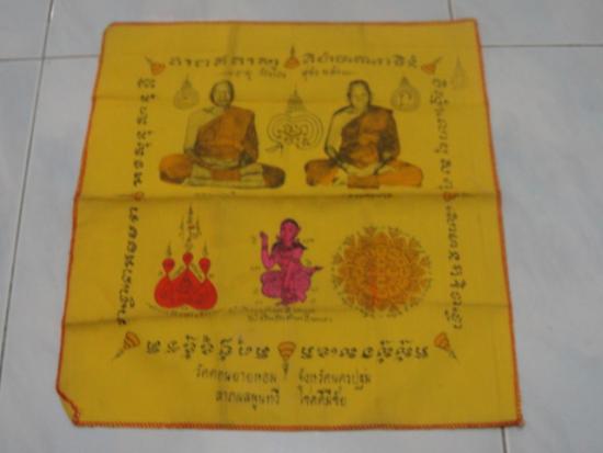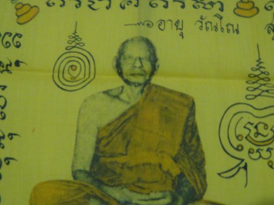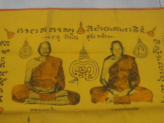 วัดใจเคาะเดียว.............ผ้ายันต์(หลวงพ่อเงิน หลวงพ่อแช่ม) วัดดอนยายหอม จ.นครปฐม อายุ84ปี ขนาด15x16 นิ้ว มีปั้มโค๊ตตรายางข้างองค์หลวงพ่อแช่ม |