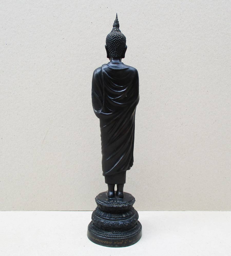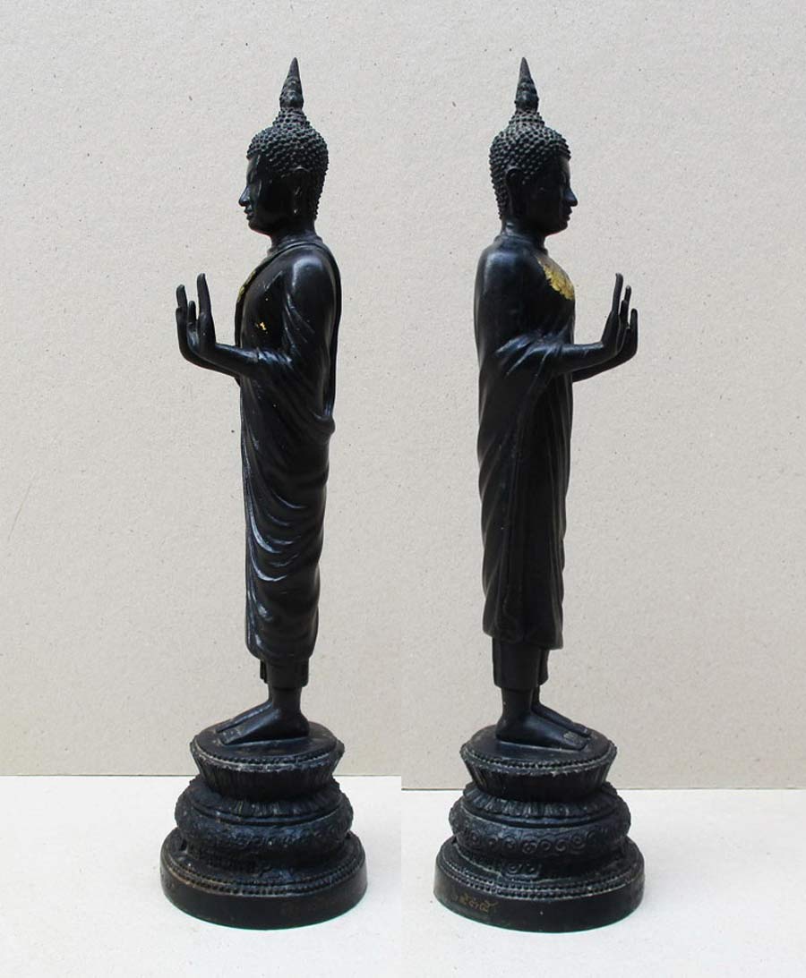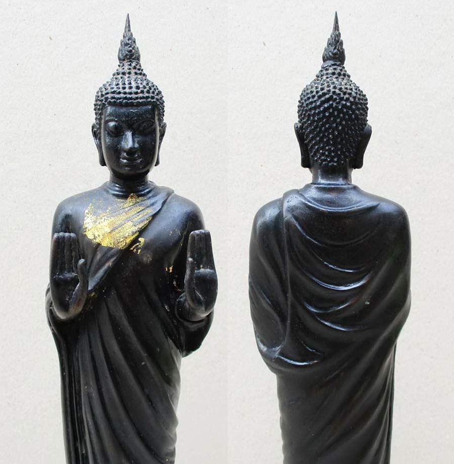 ปางยืนห้ามสมุทร เนื้อโลหะรมดำมันปู ผิวแห้งหิ้ง สภาพองค์พระสวยสมบูรณ์ !!