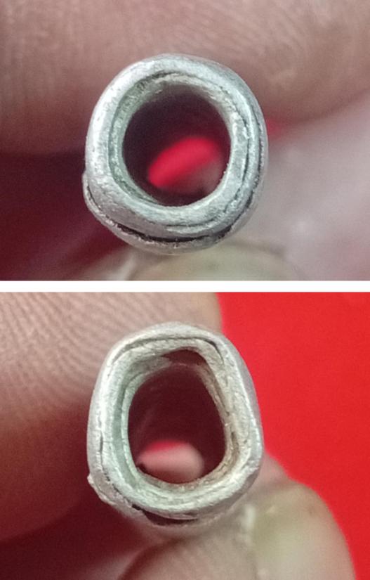 >> ตะกรุดดอกนี้ยาว 1 นิ้ว 7 หุน (4.8 เซนฯ) ขนาดโต 7 มิลฯ (หากใช้แว่นขยายส่องดูรูข้างใน จะเห็นรอยจารอักขระชัดเจน)