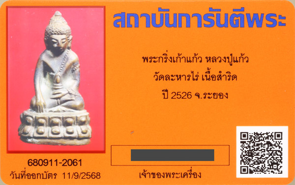 ชื่อพระเครื่อง พระกริ่งเก้าแก้ว หลวงปู่แก้ว วัดละหารไร่ เนื้อสำริด ปี2527 องค์นี้สภาพสวยเดิมครับ
