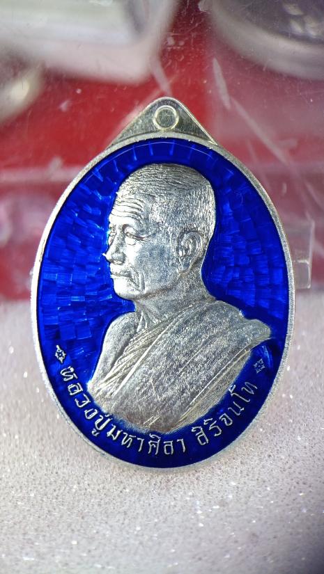 เหรียญรูปไข่หันข้าง เลื่อนสมณศักดิ์ รุ่นแรก ปี 2564 หลวงปู่มหาศิลา หลวงปู่ศิลา สิริจันโท จ.กาฬสินธุ์ เนื้อเงินลงยาสีน้ำเงิน หมายเลข 163 มีกล่องเดิม |