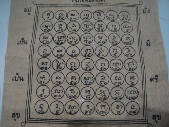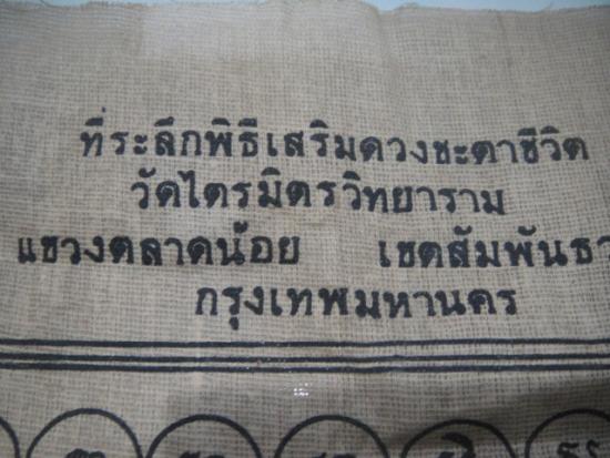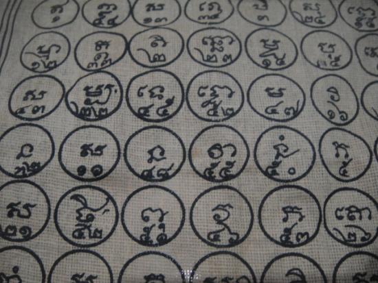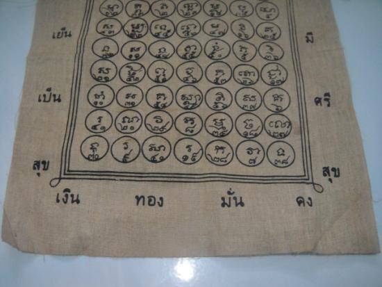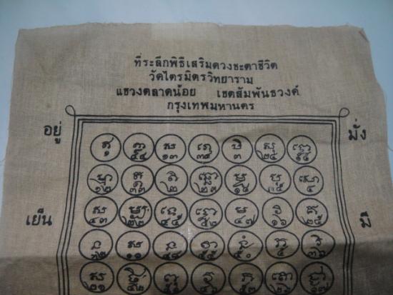 วัดใจเคาะเดียว.......100.......ผ้ายันต์เสริมดวงชะตาชีวิต วัดไตรมิตร อยู่เย็นเป็นสุข มั่งมีศรีสุข เงินทองมั่นคง เป็นผ้ายันต์พิธียุคแรกๆของท่านเจ้าคุณธงชัย ผ้าดิบเก่าๆ ขนาด 8 x 10 นิ้ว