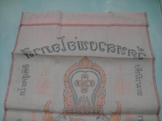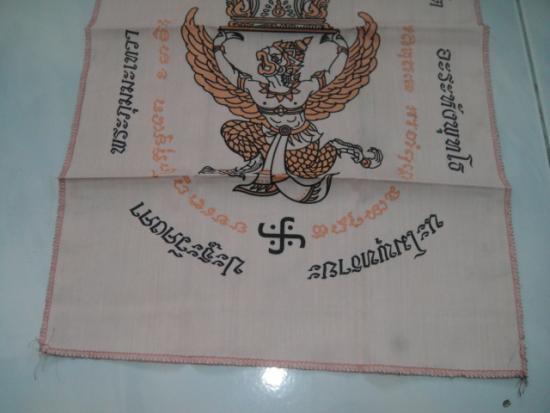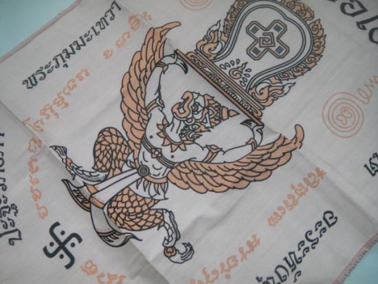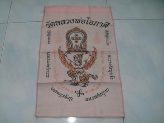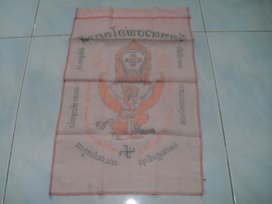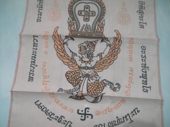 ชื่อพระเครื่อง วัดใจเคาะเดียว........100.......ผ้ายันต์ครุฑแบกเสมา วัดหลวงพ่อโอภาสี อาศรมบางมด ขนาดประมาณ 11 x 18 นิ้ว สวย