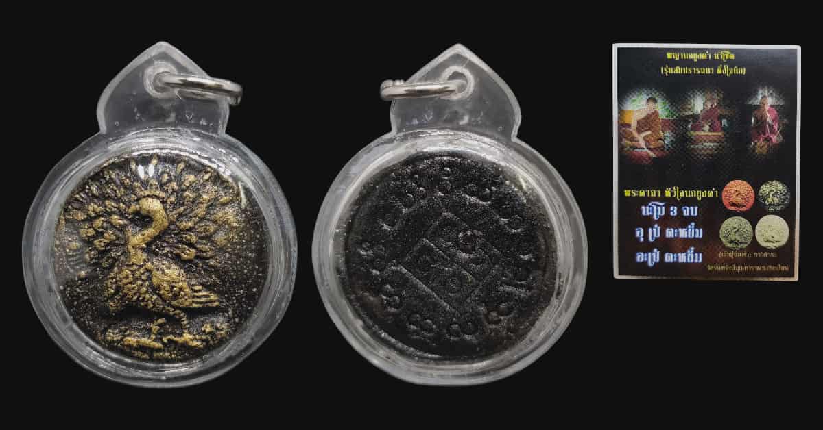 พญานกยูงคำนำโชค รุ่นแรก เนื้อดำปัดทอง เลี่ยใกรอบพร้อมใช้ เจ้าปู่จันต่า ครูบาจันทรังษี และครูบากฤษดา วัดสันพระเจ้าแดงเมตตาร่วมปลุกเสก พร้อมใบฝอยเดิม