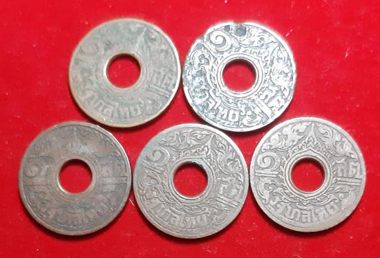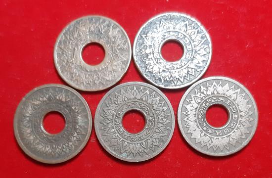 เหรียญ 1 สตางค์ สตางค์รู ลายกนกแข้งสิงห์ ร. 8 พ.ศ. 2484 เนื้อทองแดง 5 เหรียญ
