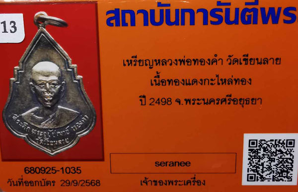 เหรียญหลวงพ่อทองคำ วัดเขียนลาย เนื้อทองแดงกะไหล่ทอง ห่วงเดิม ปี2498 จ.พระนครศรีอยุธยา + บัตรG-pra สภาพสวยเดิมค่ะ |