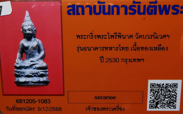 พระกริ่งพระไพรีพินาศ วัดบวรนิเวศฯ รุ่นธนาคารทหารไทย เนื้อทองเหลือง กริ่งดัง ปี2530 จ.กรุงเทพฯ + บัตรG-pra สภาพเดิมค่ะ