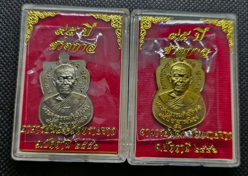 เหรียญเสมาหน้าเลื่อนสมณศักดิ์ 95 ปี ชาตกาล อาจารย์นอง วัดทรายขาว ยกคู่เนื้ออัลปาก้า ปี 2556 พร้อมเนื้อฝาบาตร พร้อมกล่องเดิม เคาะแรกแดงครับ