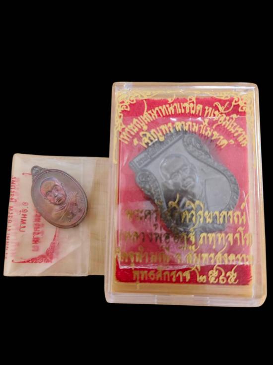 เหรียญเสมาหน้าแซยิด หูเชื่อมโบราณ เจริญพร + เหรียญเม็ดแตงมหาสิทธิโชค |