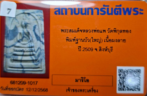 พระสมเด็จหลวงพ่อแพ วัดพิกุลทอง รุ่นไตรมาส พิมพ์ฐานบัว เนื้อผงลาย ปี 2509