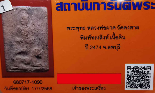 .พระพุทธ หลวงพ่อผาด วัดดงตาล พิมพ์ทรงสิงห์ เนื้อดิน ปี2474 จ.ลพบุรี + บัตรG-pra ..หลวงพ่อปานวัดบางนมโคปลุกเสก |