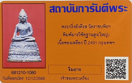 พระกริ่งอังคีรส วัดราชบพิธฯ พิมพ์มารวิชัยฐานสูง(พิมพ์ใหญ่) ปี2491 มีบัตรรับรองจีพระ เคาะเดียว