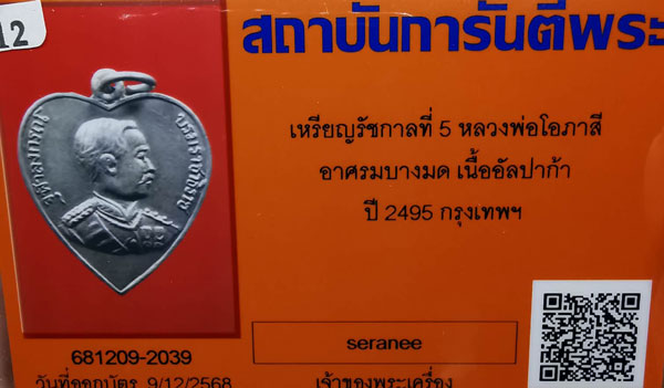 เหรียญรัชกาลที่5 หลวงพ่อโอภาสี อาศรมบางมด พิมพ์รูปหัวใจ เนื้ออัลปาก้า ห่วงเดิม ปี2495 จ.กรุงเทพฯ + บัตรG-pra สภาพเดิมค่ะ |