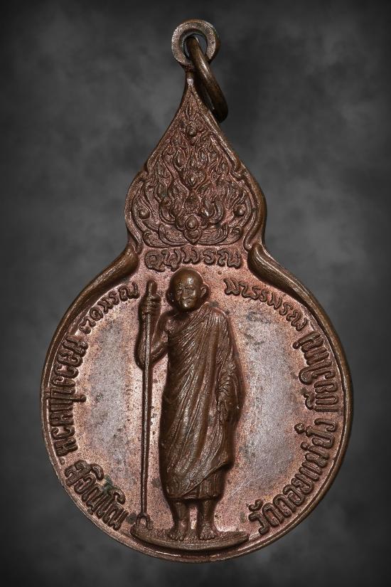 เหรียญยืนหลังพระนามาภิไธยย่อ ม.ว.ก. หลวงปู่แหวน สุจิณฺโณ วัดดอยแม่ปั๋ง อ.พร้าว จ.เชียงใหม่ ปี 2520 |