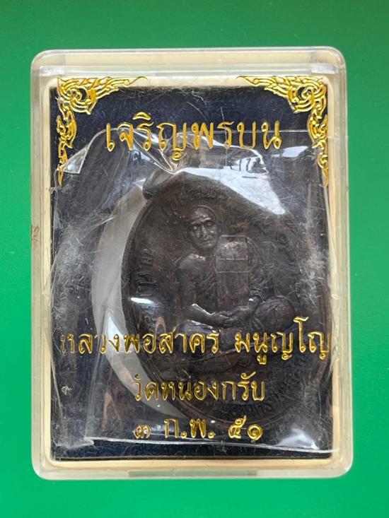 เหรียญเจริญพรบน ปี 2551 หลวงพ่อสาคร วัดหนองกรับ จ.ระยอง เนื้อทองแดงรมดำสวยๆ |