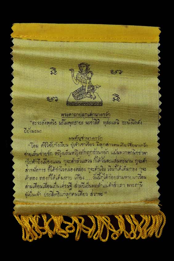 ผ้ายันต์ ( แขวนหน้ารถ - ร้านค้า , 5 x 4 นิ้ว ) หลังพระคาถาบูชานางกวัก ที่ระลึกสร้างอุโบสถ วัดบ้านไร่ พ.ศ.2534