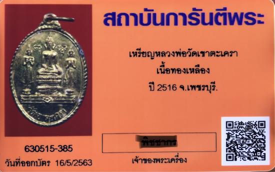 เหรียญหลวงพ่อวัดเขาตะเครา เนื้อทองเหลือง ปี 2516 จ.เพชรบุรี พร้อมบัตร สวยครับ