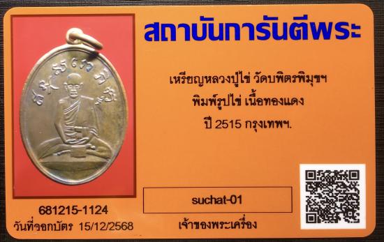 เหรียญหลวงปู่ไข่ วัดบพิตรพิมุขฯ เนื้อทองแดง ปี 2515 จ.กรุงเทพฯ |