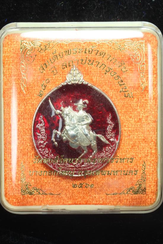 พิมพ์เล็กกะไหล่เงินลงยาแดง เหรียญสมเด็จพระเจ้าตากสินมหาราช 250 ปีสถาปนากรุงธนบุรี วัดหงส์รัตนารามราชวรวิหาร ปี 2561 ตรวจ/แก้ไขแบบ โดย อาจารย์เฉลิมชัย โฆษิตพิพัฒน์ เหรียญสวยน่าเก็บ//
