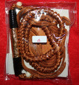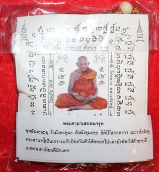 ตะกรุดมีความยาวประมาณ 3.5 นิ้ว ลงรัก ปิดทอง พร้อมเชือกถักคาดเอว ยาวประมาณ 90 ซ.ม. คั่นเม็ดด้วยประคำกระดูกช้าง 2 อัน พร้อมแผ่นยันต์สารพัดกัน และคาถาบูชาเดิมๆ จากวัด