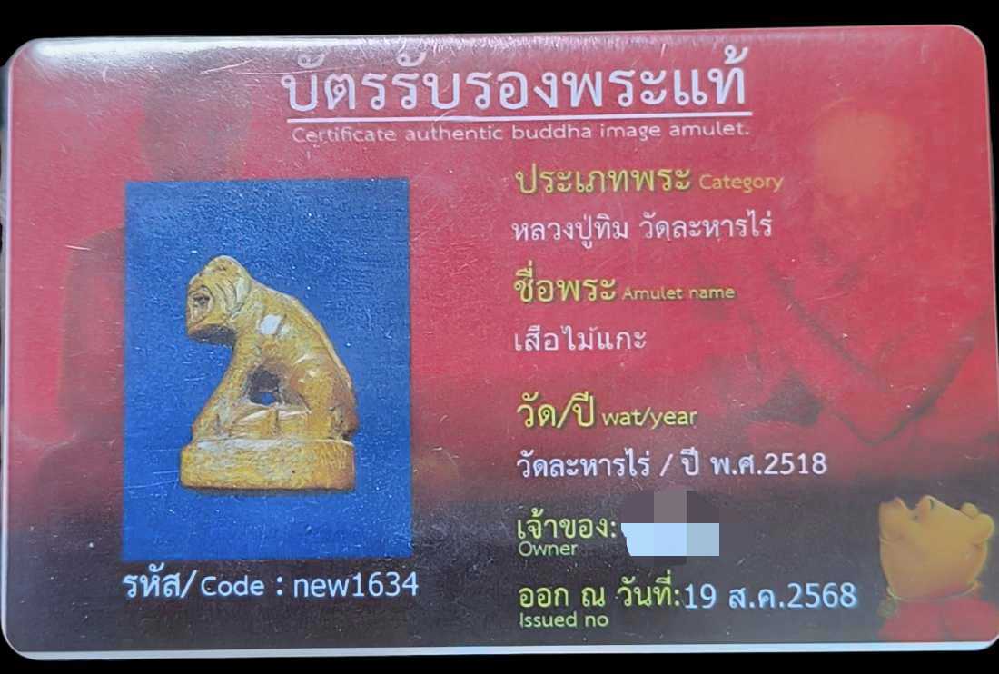 เสือไม้แกะ หลวงปู่ทิม ปี2518 วัดละหารไร่ จ.ระยอง พร้อมบัตรสายตรงหมีพูห์ |