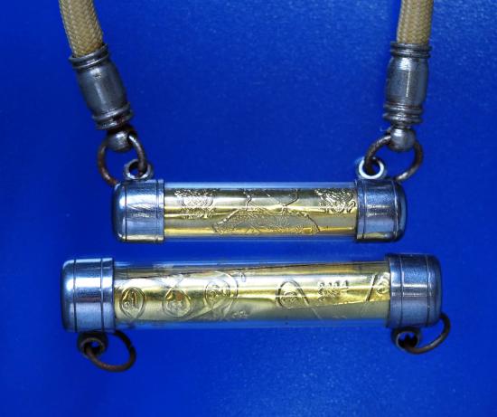 ตะกรุดเนื้อฝาบาตร พิมพ์ราย 2 ดอก (ขนาด 7 ซม. 5.5 ซม.) พร้อมหลอกปิดหัวท้าย สายสร้อยหัวสแตนเลส ขนาดยาว 28 นิ้ว สภาพเก่าเก็บ เคาะแรก