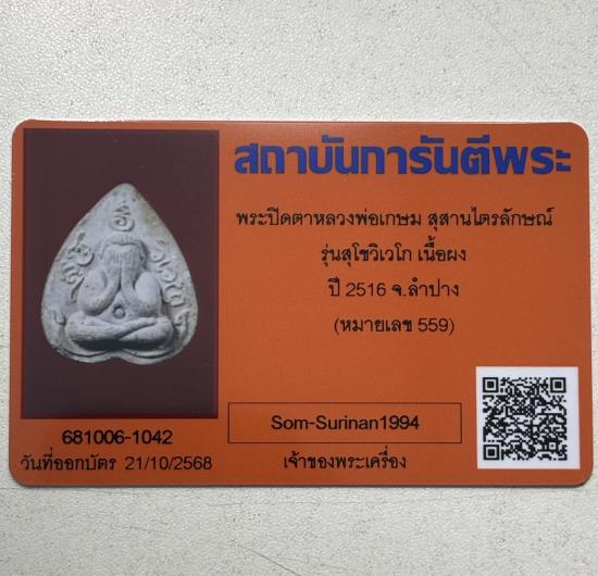 ปิดตา สุโขวิเวโก หลวงพ่อเกษม เขมโก ปี16 เลข 559 พร้อมบัตรการันตี