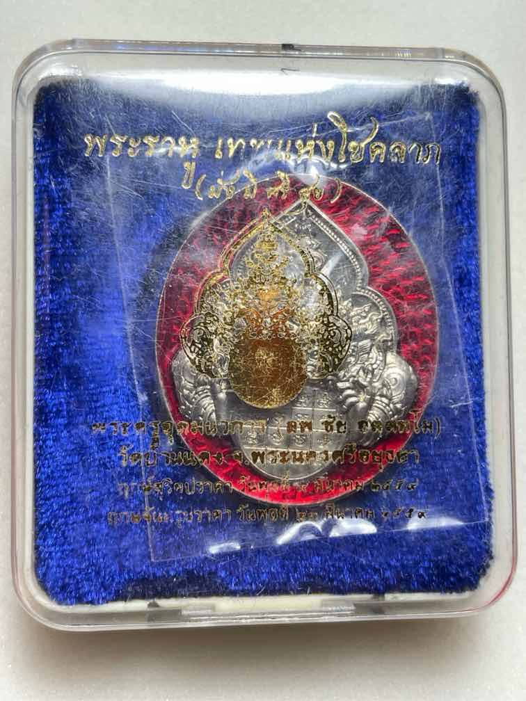 400.- ems เหรียญพระราหู รุ่นแรก #กรรมการ เนื้อทองขาวโบราณลงยาแดง เลขสวยสุดๆ no. 7 หลวงพ่อชัย วัดบ้านแดง อยุธยา (ลูกศิษย์ หลวงปู่ทิม วัดพระขาว) เสก 3 วาระ สุริยุปราคา - จันทรุปราคา สวยเดิมคากล่อง