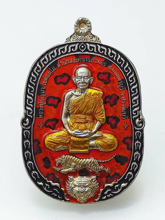 เหรียญ รุ่น มงคลมหาเศรษฐี หลวงปู่บุญมา โชติธมฺโม จ.ปราจีนบุรี เนื้ออัลปาก้า ลงยาลายเสือดาว (ส้ม/ดำ) ลงยาจีวร