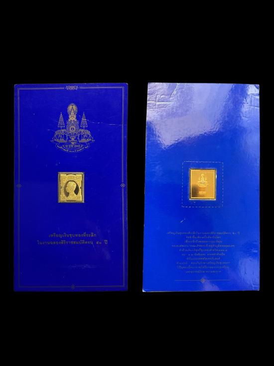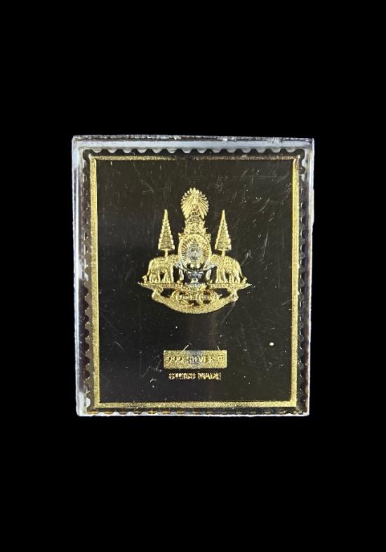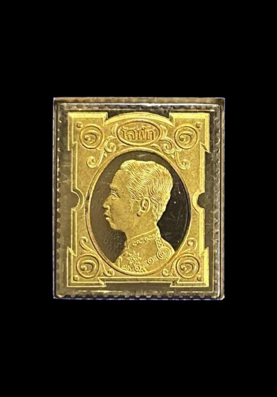 เหรียญแสตมป์ในหลวง ร.9 เนื้อเงินบริสุทธิ์ ชุบทองคำสวิส 999.9 สร้างที่ระลึกในงานฉลองศิริราชสมบัติครบ 50 ปี สร้างปี 39 ผลิตที่ประเทศสวิตเซอร์แลนด์ ชนิดอด 20 บาท (นิยม)