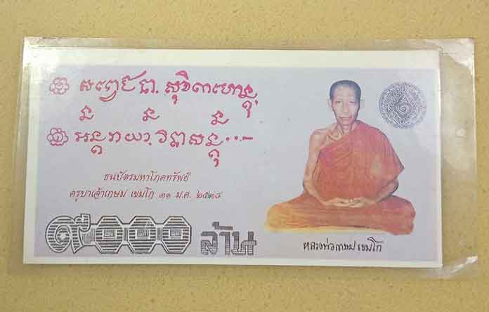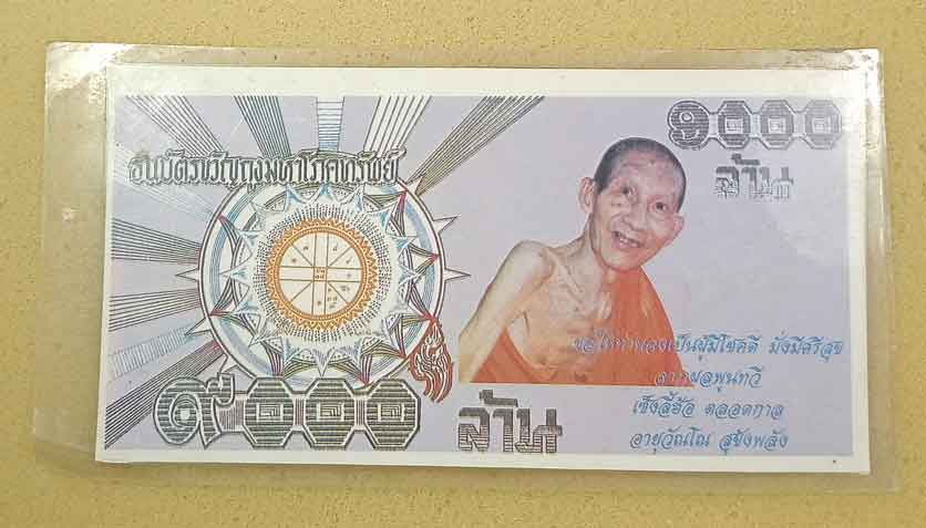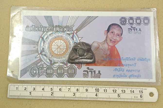 รูปหล่อ ตั้งหน้ารถ ขนาด 1 นิ้ว + ธนบัตรขวัญถุงมหาโภคทรัพย์ 9000 ล้่าน หลวงพ่อเกษม |