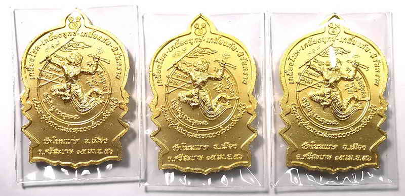 ( เคาะเดียว 1กล่อง 3องค์ ) เหรียญเสมานั่งพาน รุ่นชนะมาร หลังหนุมานเชิญธงชนะศึก เนื้อทองแดงกะหลั่ยทองลงยา ชุด 3 สี หลวงปู่เกลี้ยง วัดโนนแกด จ.ศรีสะเกษ พ.ศ.2556 สร้างเพียง 999ชุดเท่านั้น ตอกโค๊ตและหมายเลขเดียวกันทั้ง3เหรียญ