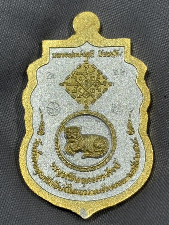 เหรียญเสมาพญาเสืออุดมทรัพย์ พระอาจารย์ประสูติ (หลวงพ่อประสูติ) วัดในเตา ตรัง เนื้อ2K องค์2K พื้นเงิน ขอบทอง หมายเลข62