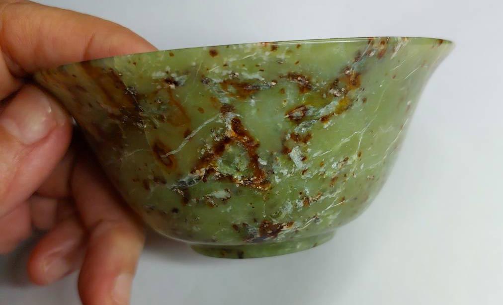 ถ้วยหยกขนาด 4 นิ้ว สูง2 นิ้ว มีปิ่น1จุด มีสายแร่ทั้งใบ |