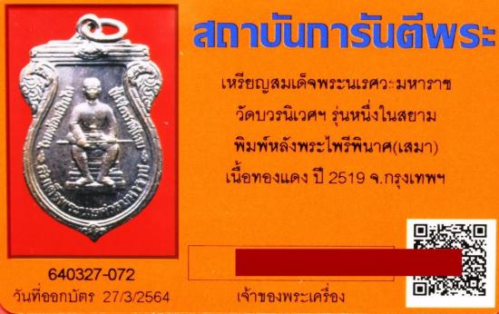 เหรียญสมเด็จพระนเรศวรมหาราช วัดบวรนิเวศฯ รุ่นหนึ่งในสยาม พิมพ์หลังพระไพรีพินาศ(เสมา) เนื้อทองแดง ปี 2519 จ.กรุงเทพ มีบัตรรับรอง