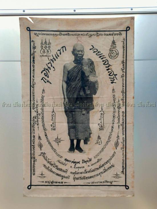 ผ้ายันต์กูยืนรุ่นแรก รวยแสนล้าน ( 22.5 X 35.5 นิ้ว ) ฉลองชนมายุ 76 ปี พ.ศ.2542 ( จารยันต์อักขระ " นะ " ลายมือหลวงพ่อคูณ , สภาพใช้ , มีรอยโดนไหม้ 1 จุด , ตราปั้ม เฮง หมึกแดงจางหาย )