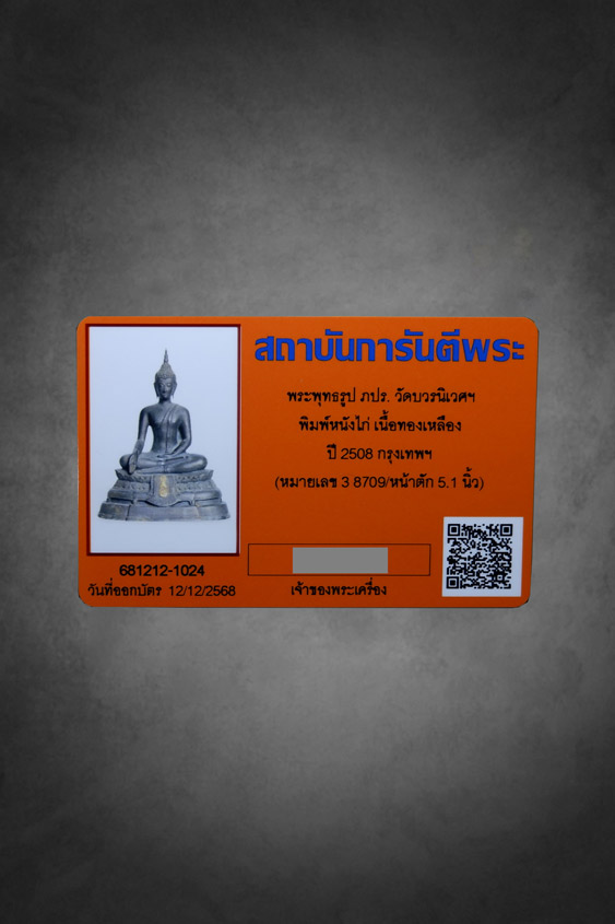 ชื่อพระเครื่อง พระบูชา ภปร.ปี 2508 วัดบวรนิเวศวิหาร บล็อคหนังไก่ หน้าตัก 5 นิ้วมาพร้อมบัตรการันตีแท้ (หมวด3 หมายเลของค์พระ 8709)