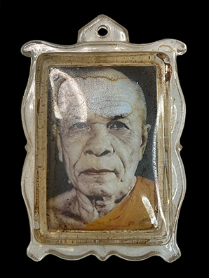 ล็อกเก็ตรูปหลวงพ่อสด วัดปากน้ำ ด้านหน้าตอกโค๊ต หลังฝังล็อคเก็ต จีวรและยันต์ |