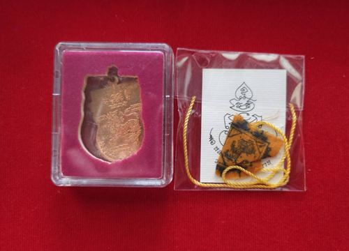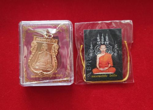 หลวงพ่อวิชัย วัดหัวเด่น เหรียญเสมาหลังสิงห์นพเก้า(ไตรมาส 64)เนื้อทองแดง + รูปถ่ายหลังยันต์ จีวรปั๊มสิงห์ สายสินธุ รวม 2 อย่าง