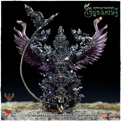 รายละเอียด พญาครุฑทรงมหิธานุภาพ เชิญธงเศรษฐี วัดครุฑธาราม จ.พระนครศรีอยุธยา พิมพ์ใหญ่ สูง 4.5 ซ.ม. เนื้อเหล็กน้ำพี้ (สัมฤทธิ์เดช) ปีกทองแดงเถื่อน ซีลเดิมยังไม่ได้แกะ
