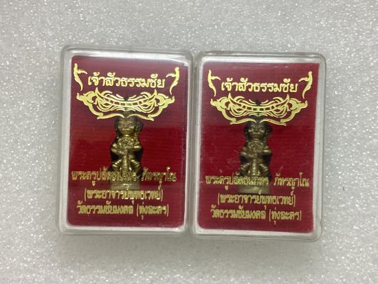 ชื่อพระเครื่อง เคาะเดียวแดง 100 ( 2 องค์ ) ท้าวเวสสุวรรณ เจ้าสัวธรรมชัย พระอาจารย์ภัทรญาโณ ภิกขุ วัดธรรมชัยมงคล (ทุ่งละคร) จ.เชียงใหม่ สูง 2.3 ซ.ม. เนื้อบรอนซ์ทอง กล่องเดิม