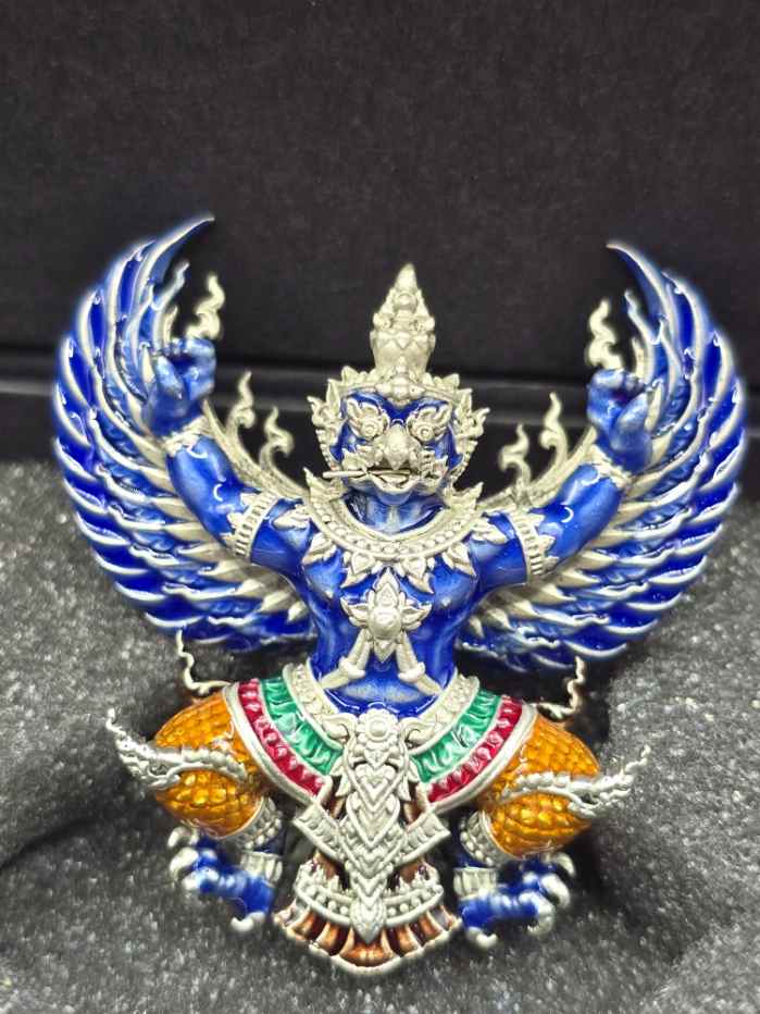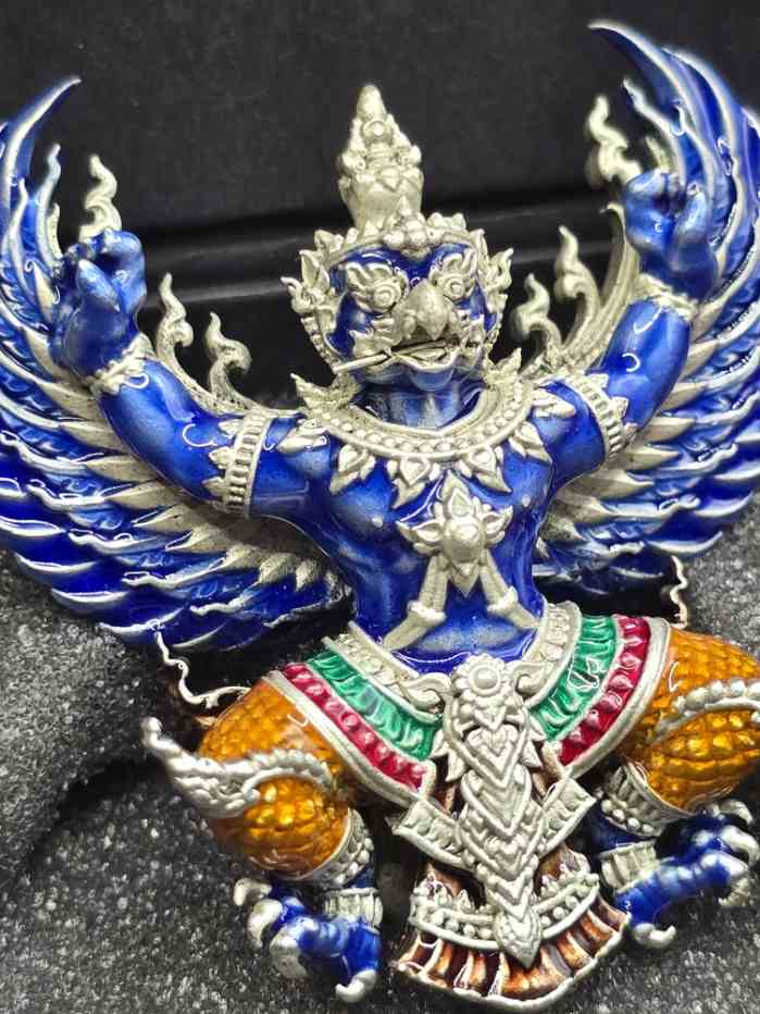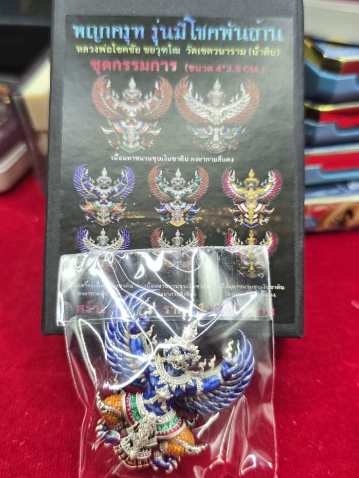 พญาครุฑ รุ่นมีโชคพันล้าน หลวงพ่อโชคชัย วัดน้ำดิบ เนื้อมหาชนวนชุบเงินซาตินกายน้ำเงิน แยกชุดกรรมการ หมายเลข 74 พร้อมกล่องเดิม |