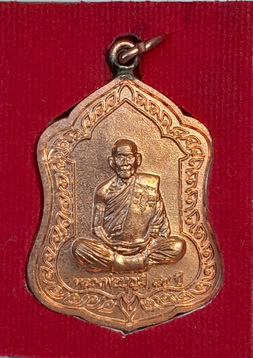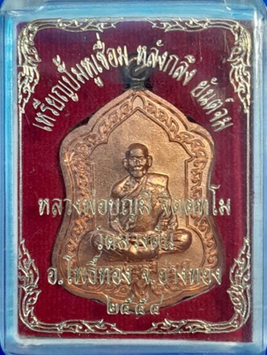 เหรียญปั๊มหูเชื่อม หลังกลึง ยันต์จม หลวงพ่อบุญี วัดม่วงคัน จ.อ่างทอง เนื้อทองแดงผิวไฟ พร้อมกล่องเดิมจากวัด |