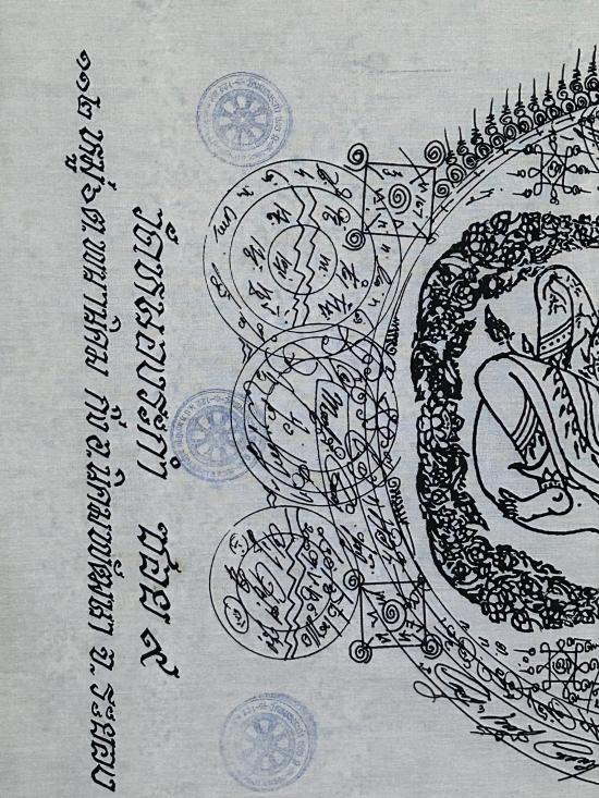 จัดไป 3 ผืน....ผ้ายันต์พระพุทธธรรมจักรทิพย์ญาณไตรโลก วัดหนองระกำ อาจารย์หม่อมเขียนออกแบบยันต์ หลวงปู่ละมัยปลุกเสก ขนาด 112x47 ซ.ม. ผืนใหญ่ ชุดที่ 4 |