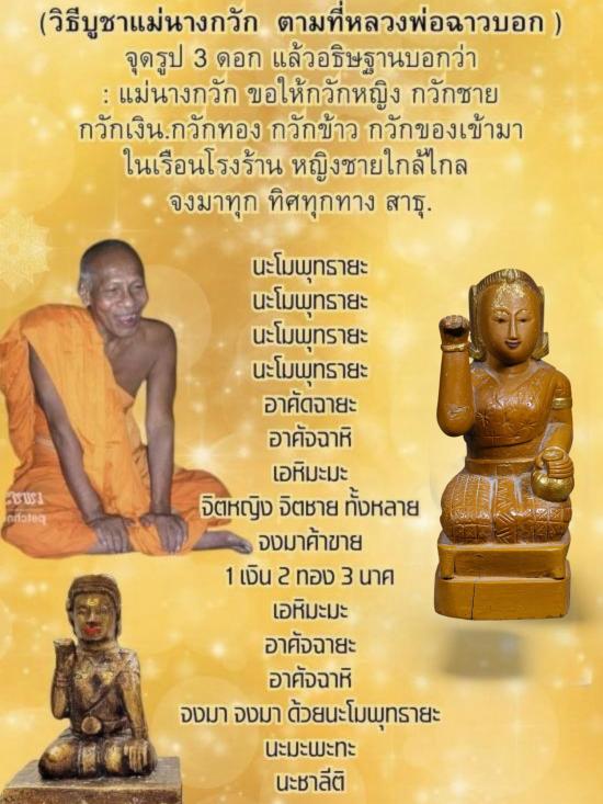 แม่นางกวักไม้แกะ ยุคต้น หลวงพ่อฉาว วัดสว่างชาติประชาบำรุง จ.นครปฐม หน้าตัก 2.7นิ้ว สูง7นิ้ว หลวงพ่อฉาว ท่านโด่งดังมากเรื่องแม่นางกวัก โดยเฉพาะรุ่นแรกๆนั้น เป็นที่ต้องการอย่างมากกับคนในและนอกพื้นที่ ปัจจุบันนี้หายากมากๆ ตลอดเวลาที่ผ่านมาจนถึงปัจจุบันนี้ หลวงพ่อฉาวสร้างแม่นางกวักมาตลอด ท่านจะเน้นเรื่องเมตตา ค้าขายเป็นหลัก แต่แม่นางกวักของท่านกลับมีพุทธคุณด้านอื่นๆอยู่ด้วย ซึ่งคนในพื้นที่รู้ดีและต่างมีประสบการณ์มากมาย คำกล่าวที่หลวงพ่อมักจะกล่าวกับศิษย์ที่ใกล้ชิดมาตลอดว่า ของ ของฉันปืนก็ไม่ได้กิน ถ้าไม่ใช้ของฉันแล้วจะรู้ว่าดีอย่างไร วัตถุมงคลที่หลายเกจิสร้างเกี่ยวกับแม่นางกวัก น้อยนักที่จะมีพุทธคุณด้านนี้รวมอยู่ด้วย ซึ่งแม่นางกวักของท่านแม้กระทั่งปืนยังยิงไม่ออก นี่เป็นเรื่องจริงที่ลูกศิษย์ที่บูชาแม่นางกวักของท่านได้ประสบกับตัวเอง