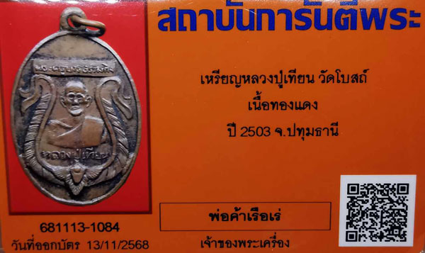 เหรียญหลวงปู่เทียน วัดโบสถ์ เนื้อทองแดง ห่วงเดิม ปี2503 จ.ปทุมธานี + บัตรG-pra สภาพเดิมค่ะ สภาพตามรูปทุกประการค่ะ